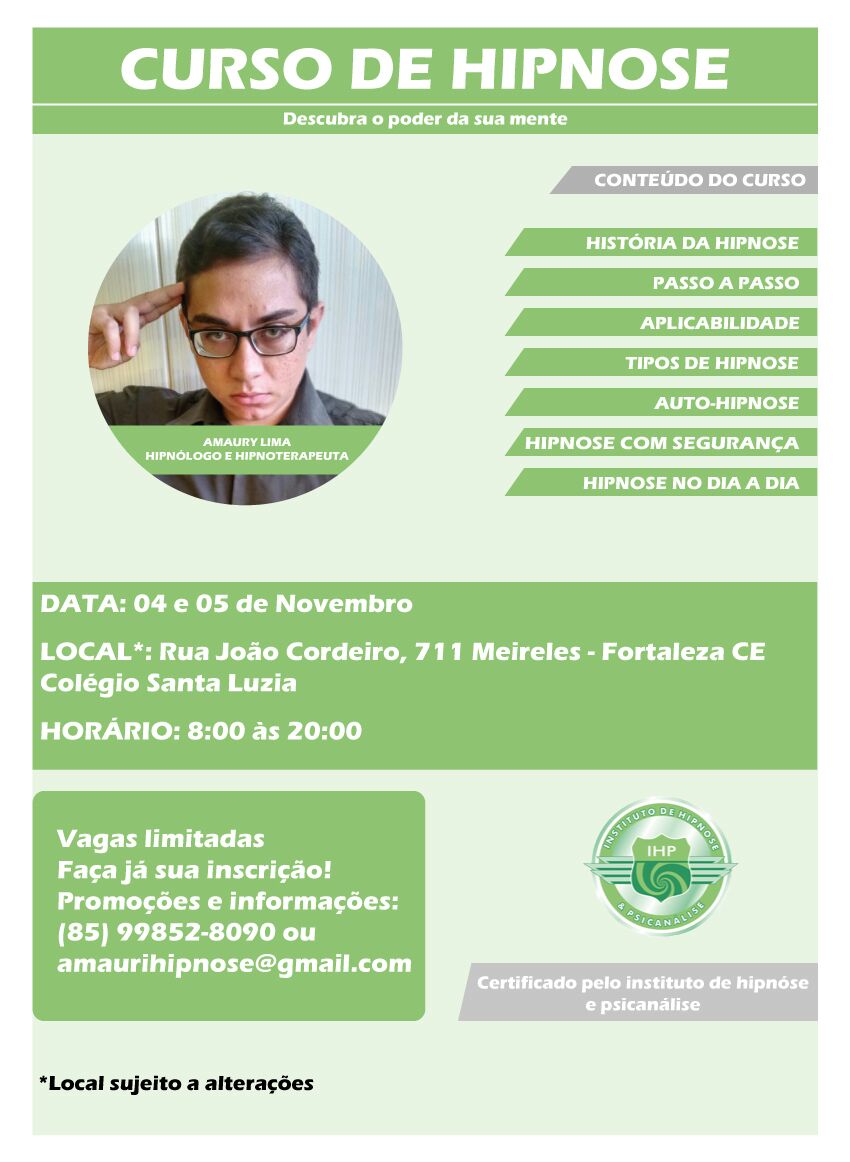 IHP - Instituto de Hipnose & Psicanálise licenciou nosso professor Antônio Amauri Costa de Lima Júnior para você de Fortaleza e região possam aprender a hipnose com a qualidade e exigência de nossa instituição.